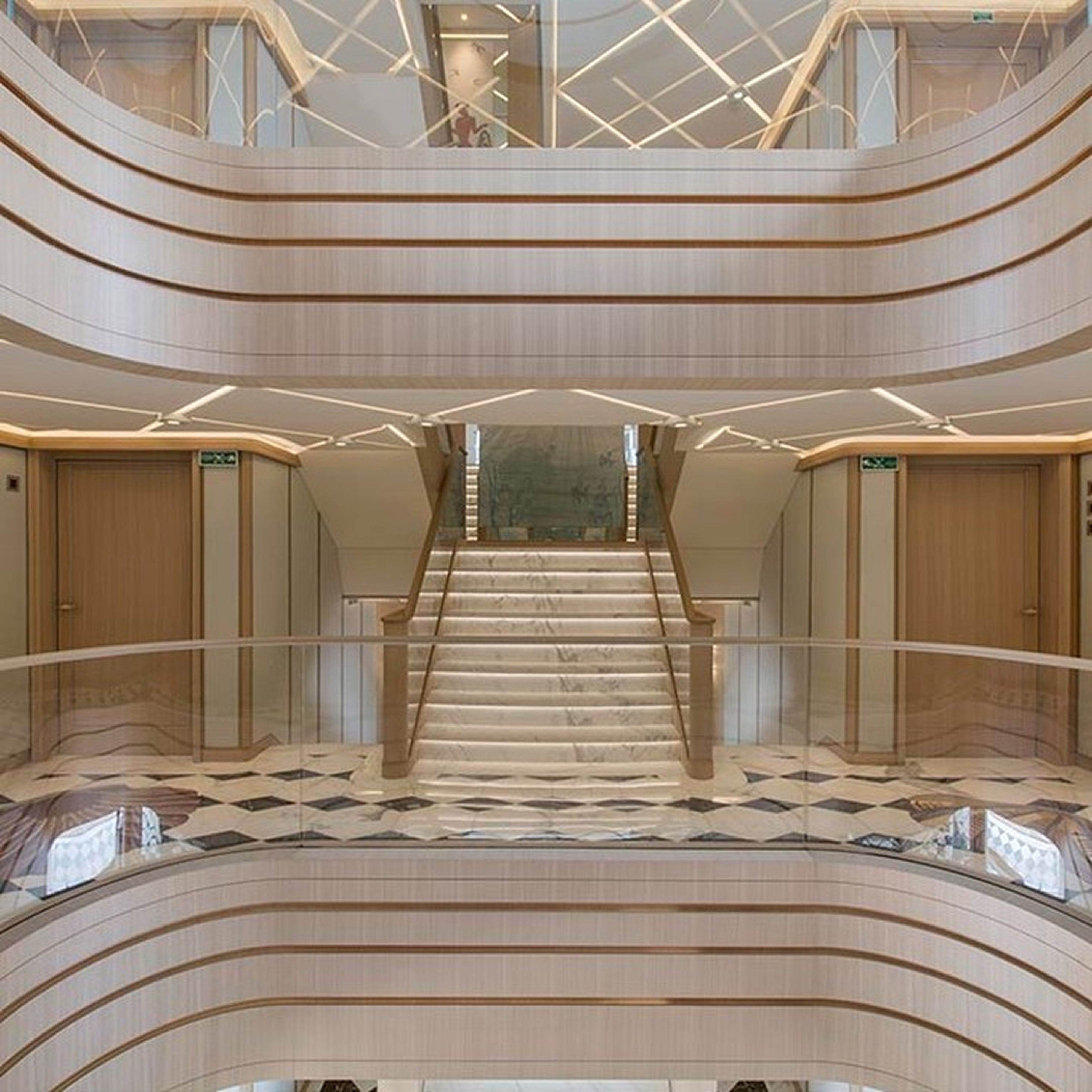 A precise refinish of the interior main staircase on a 106-meter superyacht, restoring the warmth of the wood tones while applying a durable water-based varnish system.