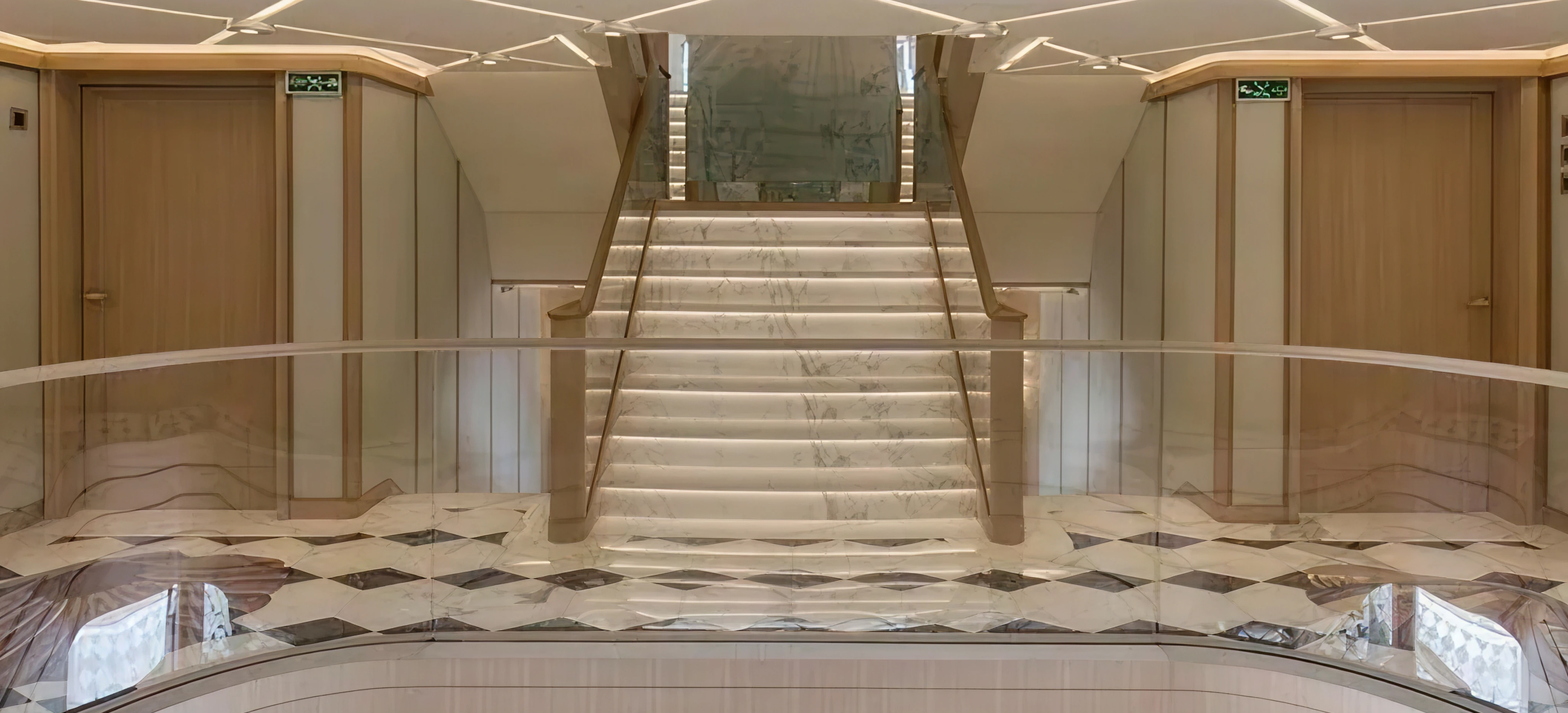 A precise refinish of the interior main staircase on a 106-meter superyacht, restoring the warmth of the wood tones while applying a durable water-based varnish system.